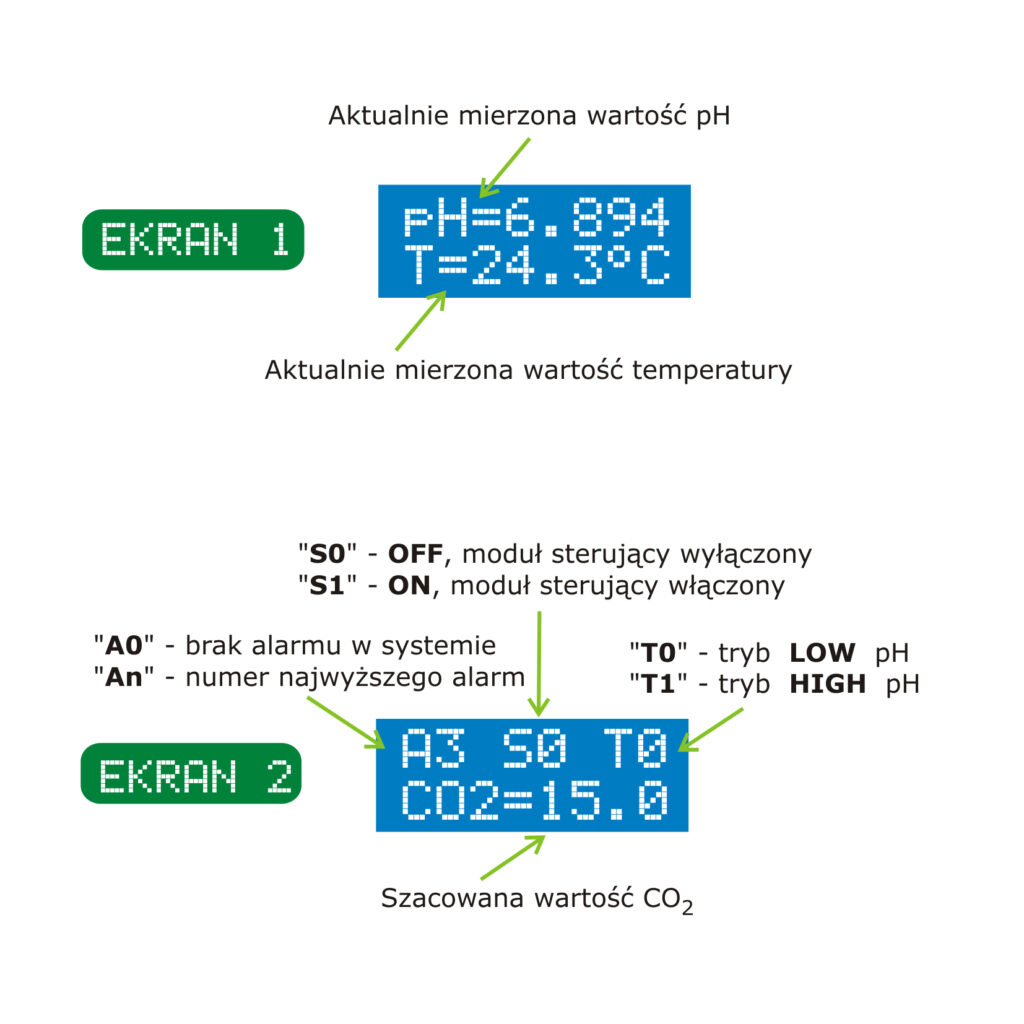 Pomiar pH, alarmy, tryb działania, stan kontrolera (LCD)