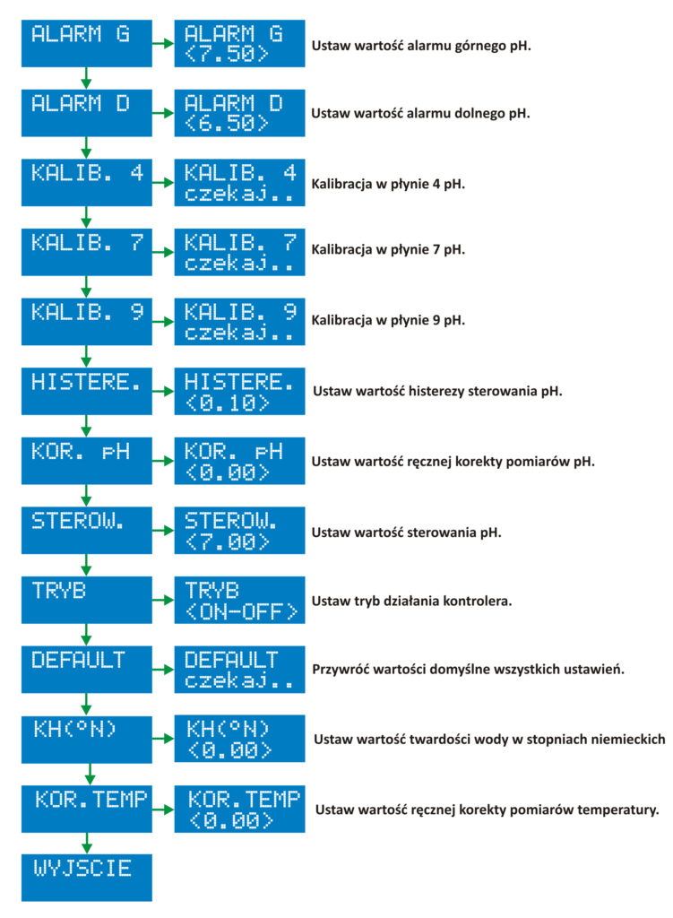 - Posiada możliwość ręcznej korekty pomiarów pH (ustawienie „KOR pH” w menu kontrolera) przydatnej przy sprawdzaniu płynów kalibracyjnych, porównaniu z innymi kontrolerami czy korektą wskazań starszych czujników pH.