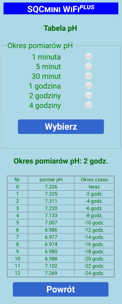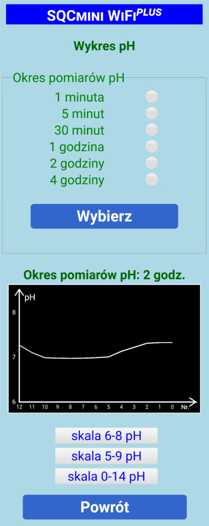Wizualizacja graficzna zmian pH w czasie przedstawia wykres zależności pH od czasu w przedziale od teraz do 12 wybranych okresów wstecz. W okresie 1 minuty widzimy zmiany pH przez ostatnie 12 minut, itd. aż do okresu 4 godzin, gdzie widzimy zmiany pH w czasie ostatnich 48 godzin.